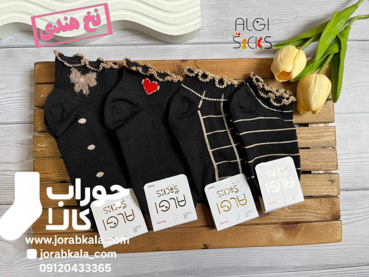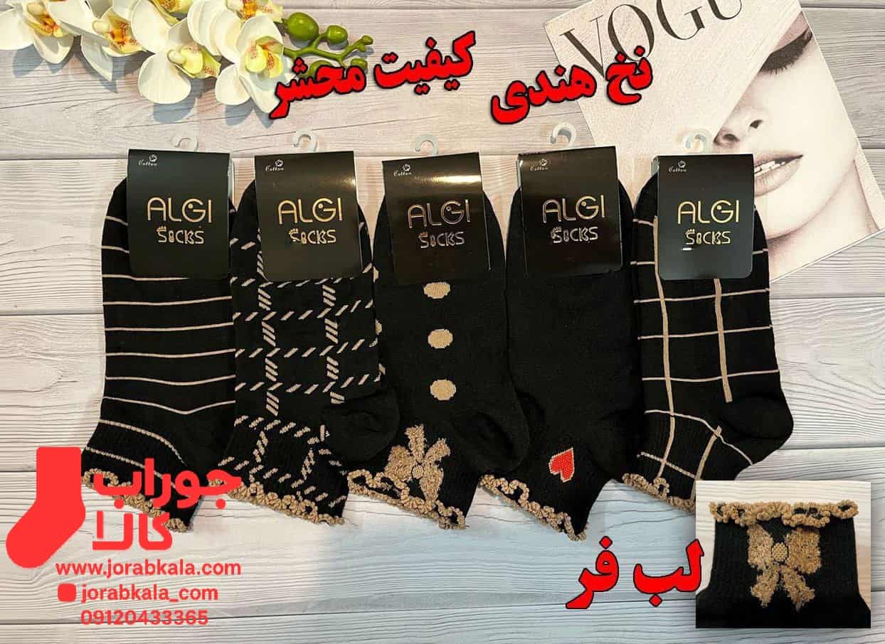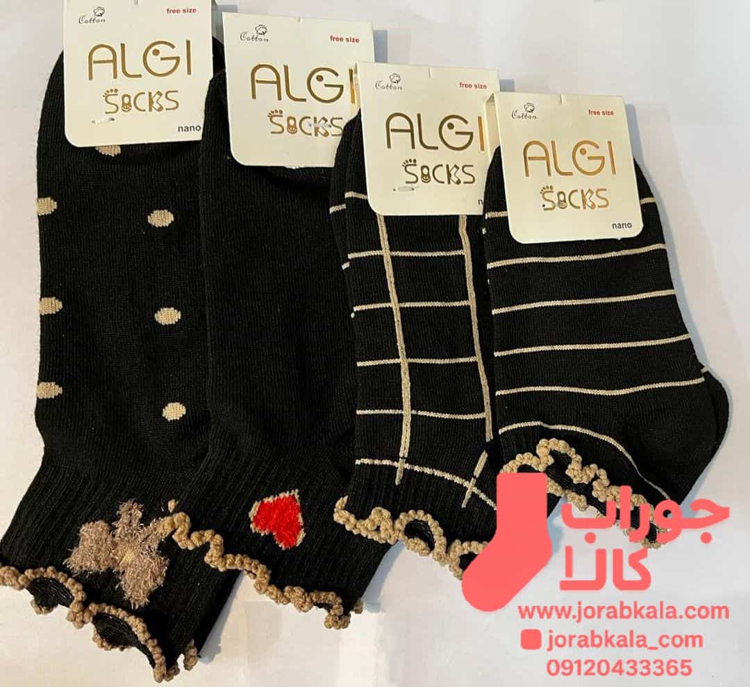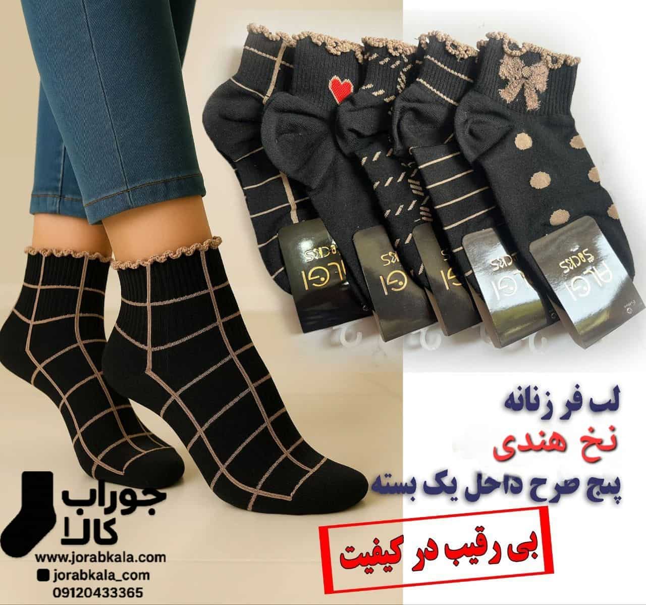 جوراب مچی زنانه فانتزی تم کرمی و مشکی لب فر